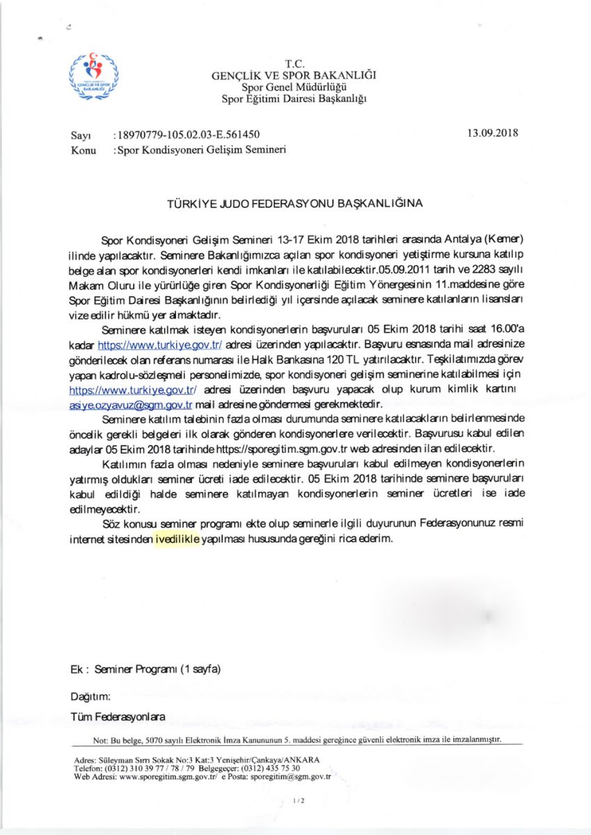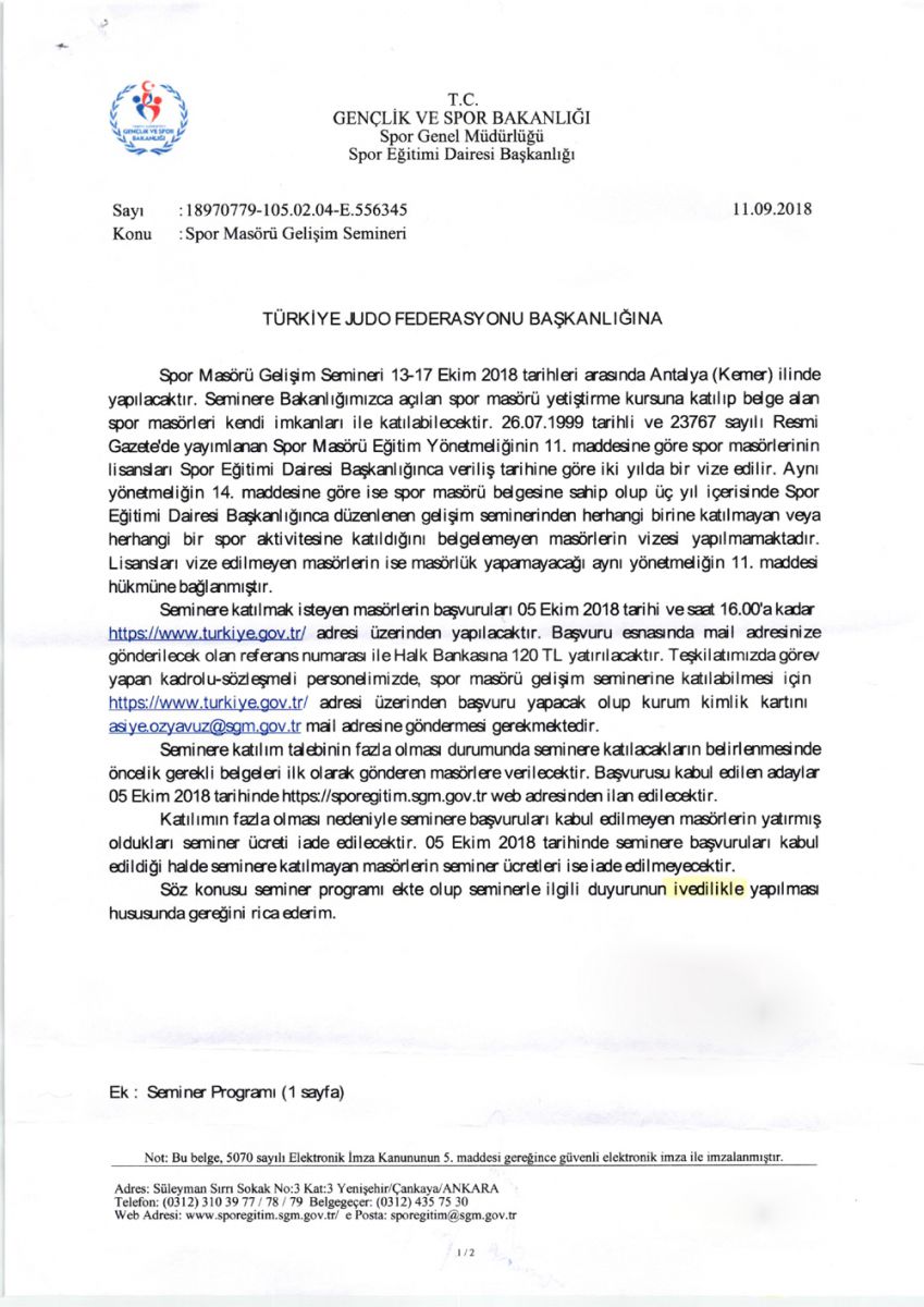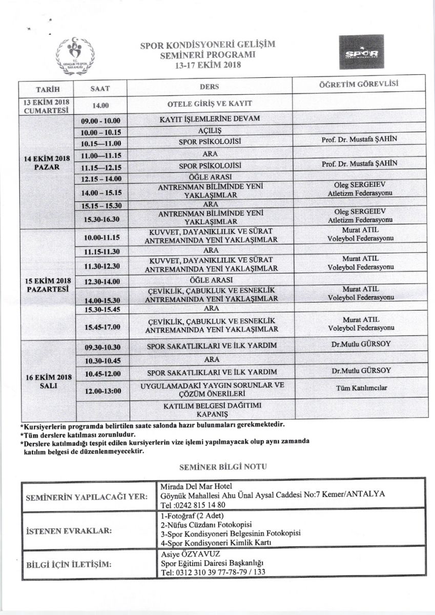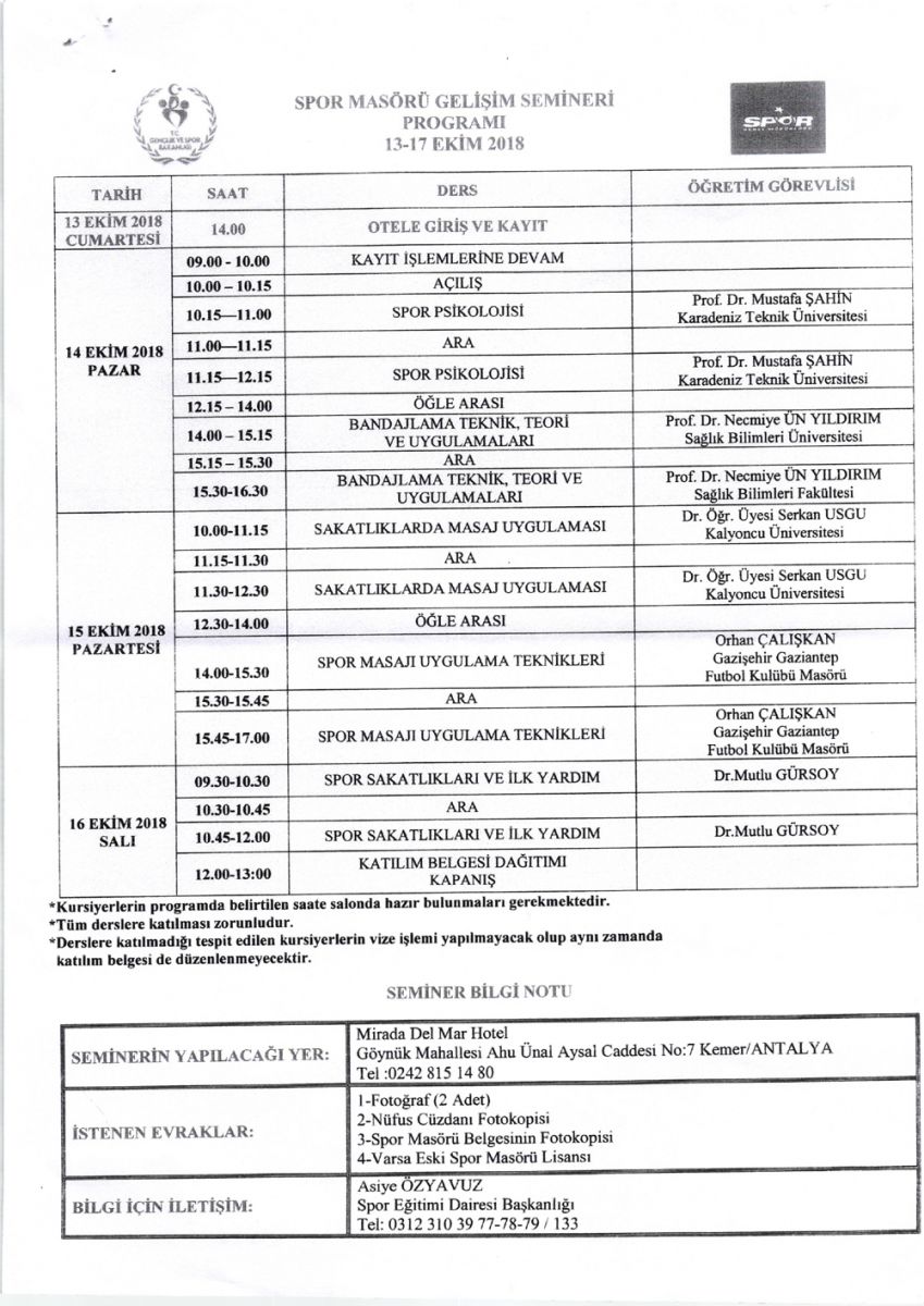 Spor Eğitim Dairesi Başkanlığı tarafından yapılan açıklama ile spor masörü ve kondisyoneri gelişim seminerleri, 13-17 Ekim 2018 tarihleri arasında Antalya Kemer’de yapılacağı duyuruldu. Spor Genel Müdürlüğü bünyesinde spor masörü ve kondisyoneri olarak görev yapmakta olanların seminere katılmaları şart olarak belirtildi.